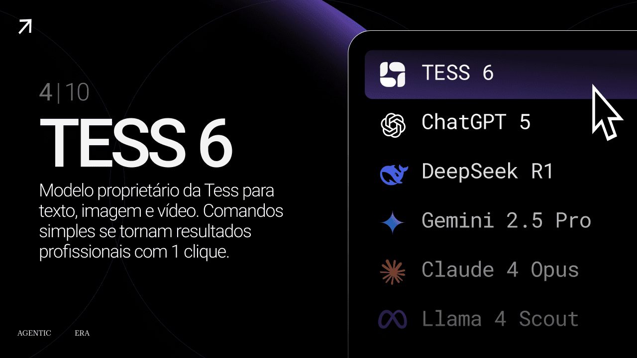 O TESS 6 é o novo modelo proprietário da Tess para textos, imagens e vídeos, desenvolvido para entregar o que há de mais avançado no mundo em termos de qualidade de resposta de IA.
